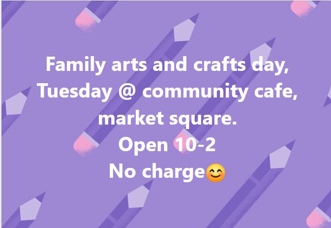Family arts and crafts day, Tuesday at the community cafe, market square. Open 10am-2pm.