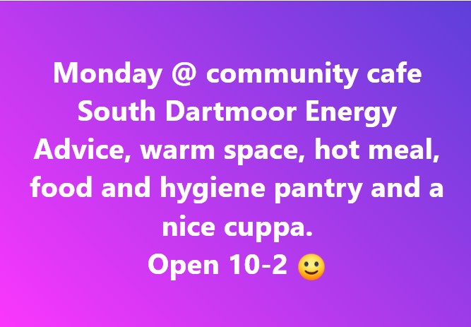 South Dartmoor Energy advice, warm space, hot meal, food and hygiene pantry and a nice cuppa.