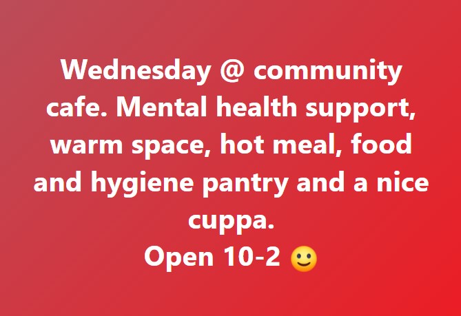 Mental health support, warm space, hot meal, food and hygiene pantry and a nice cuppa. Open 10am-2pm